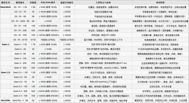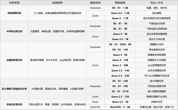 DeepSeek:DS – R1 – 7B 平衡性能与资源;DS – R1 – 8B 平衡性能与资源消耗。