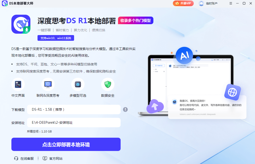 DS本地部署大师是一款集多种AI模型于一体的本地化部署工具,它以一键部署、多模型支持、数据隐私保护等特性,为用户提供了便捷、安全、灵活的AI应用体验,适用于个人和企业用户在不同场景下的多样化需求。